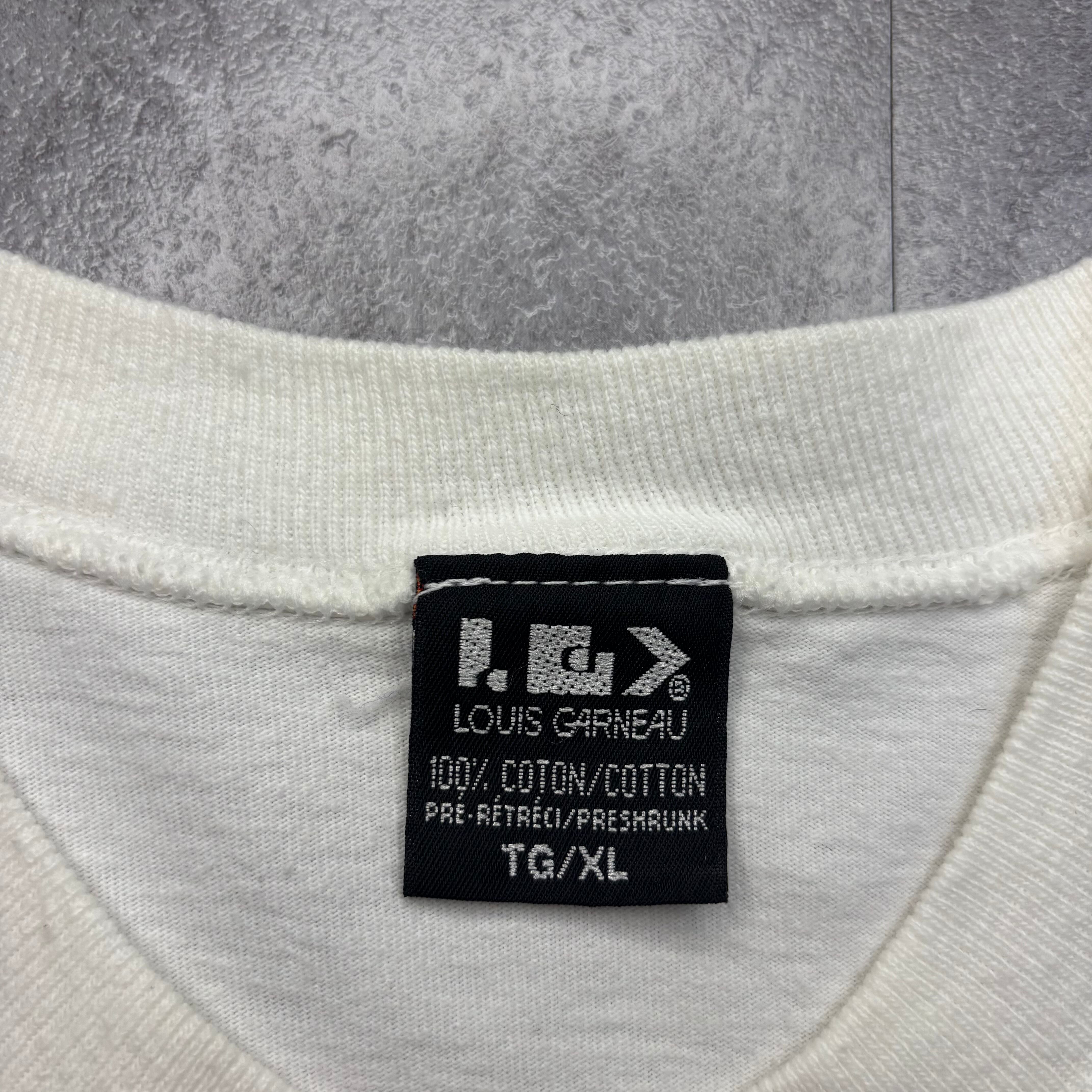 タグは「L.G. / LOUIS GARNEAU」表記、100% COTTON、PRE-SHRUNK仕様、サイズ表記はXL(TG/XL)となっています。しっかりしたボディ感とゆったりとしたサイズ感で、ユニセックスでの着用もおすすめです。