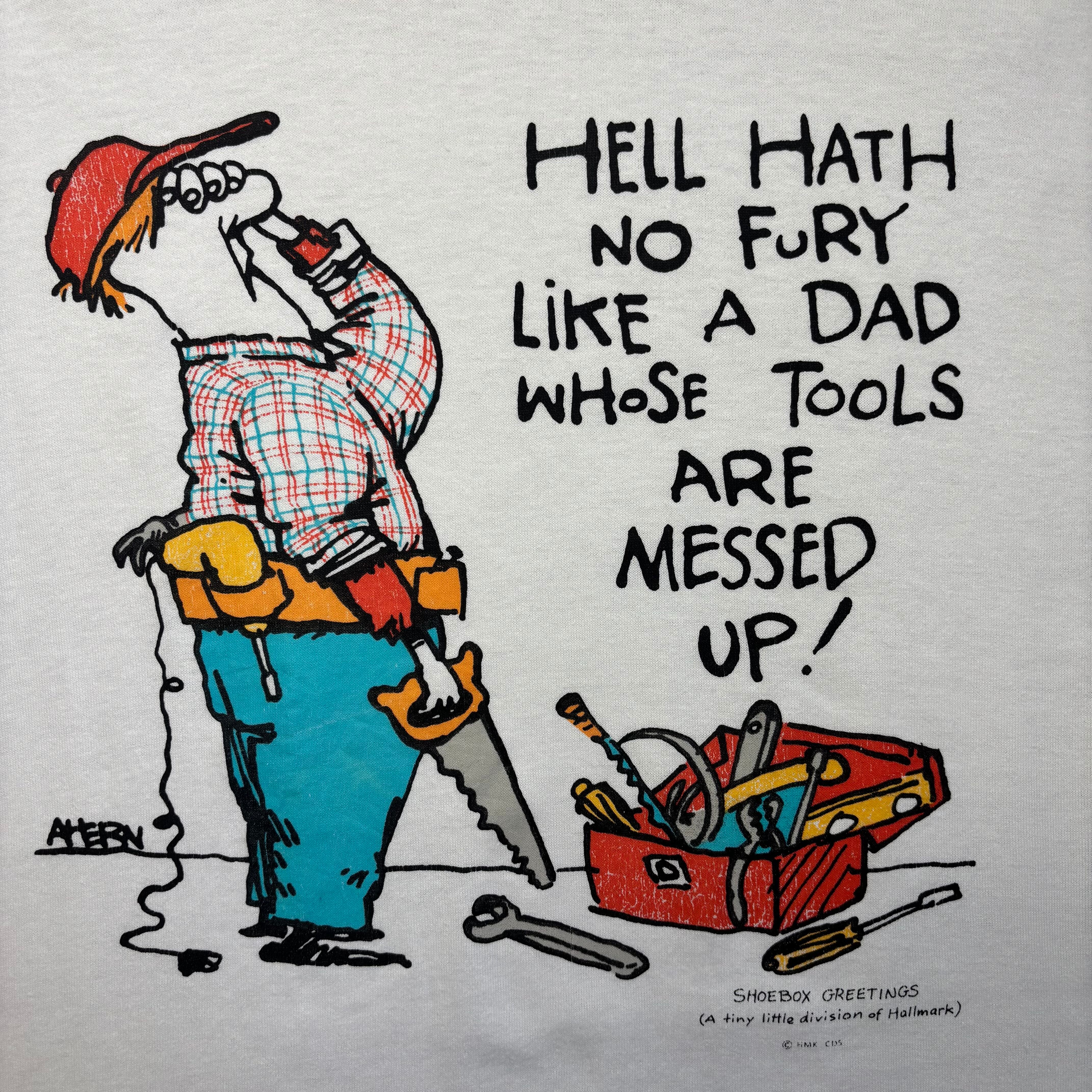 フロントには「HELL HATH NO FURY LIKE A DAD WHOSE TOOLS ARE MESSED UP!(工具が台無しになった時の父親ほど恐ろしいものはない)」というユーモアたっぷりの英文と、キャラクターイラストが大きくプリントされた印象的な一枚。
