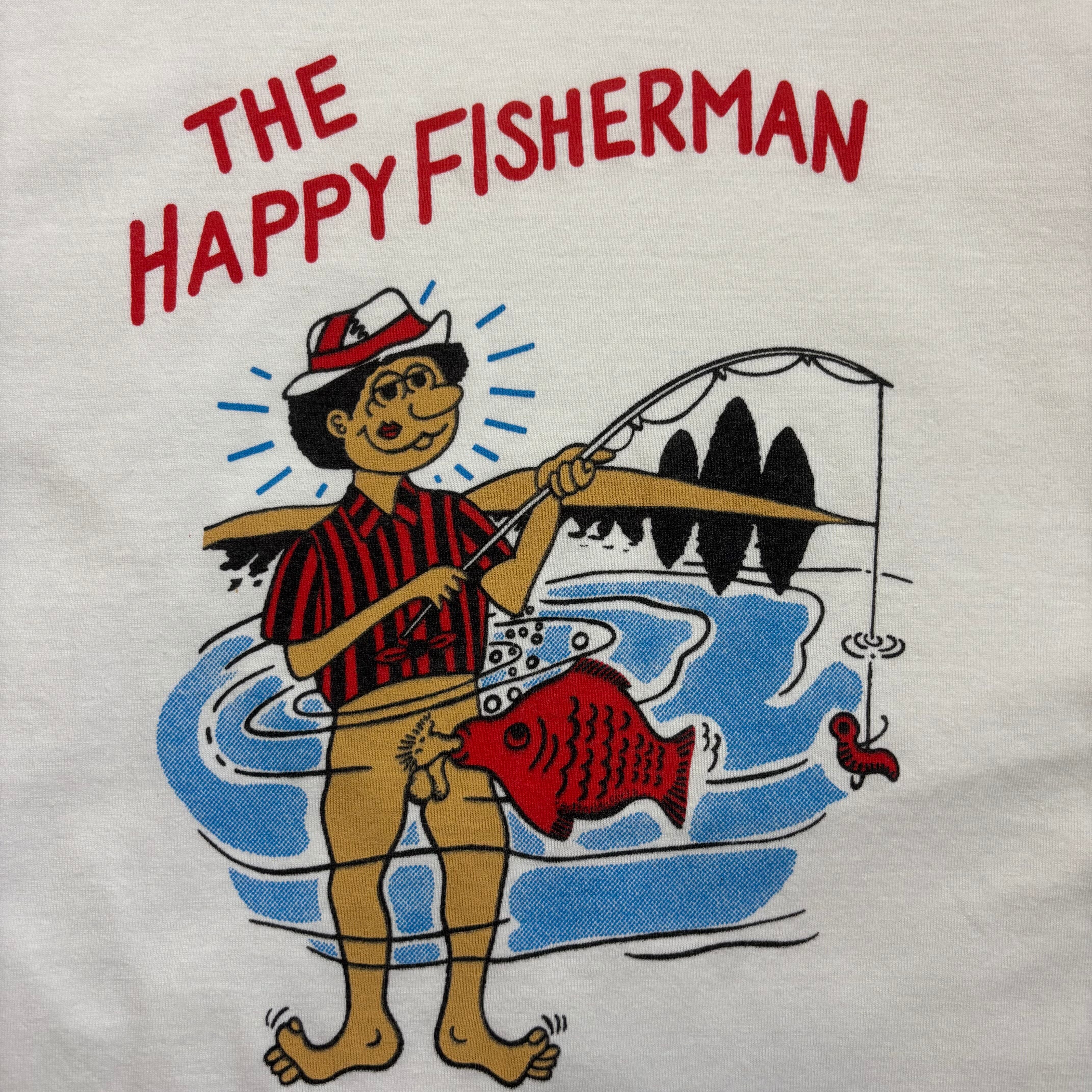 「THE HAPPY FISHERMAN」のユニークなグラフィックがプリントされたTシャツです。