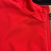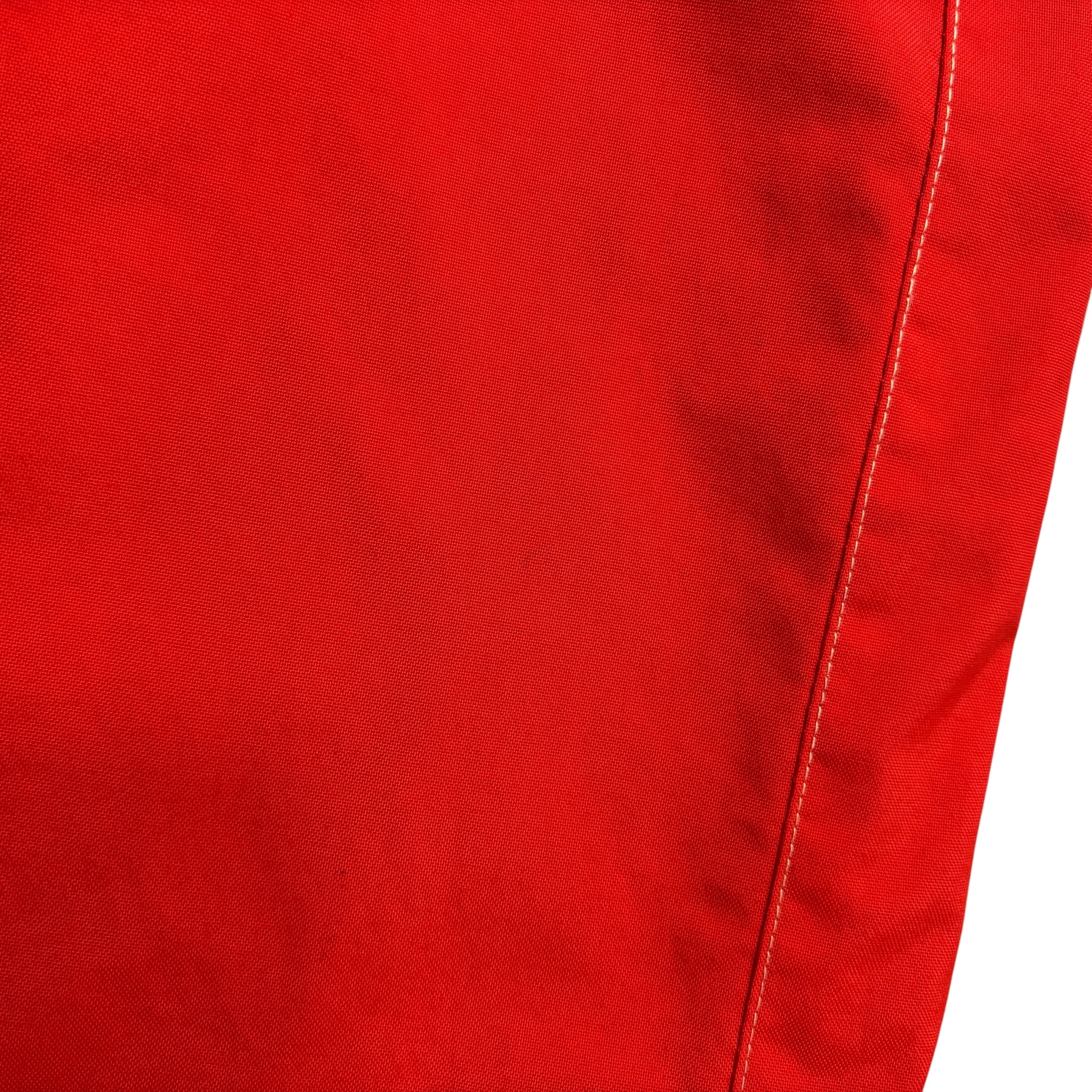 鮮やかなレッドをベースに、ベージュのパネル切り替えが特徴的な一着。左胸にはブランドロゴ刺繍入り。軽量で動きやすく、ストリートコーデやスポーツミックススタイルにもぴったりです。メッシュ裏地付きで通気性も確保されています。