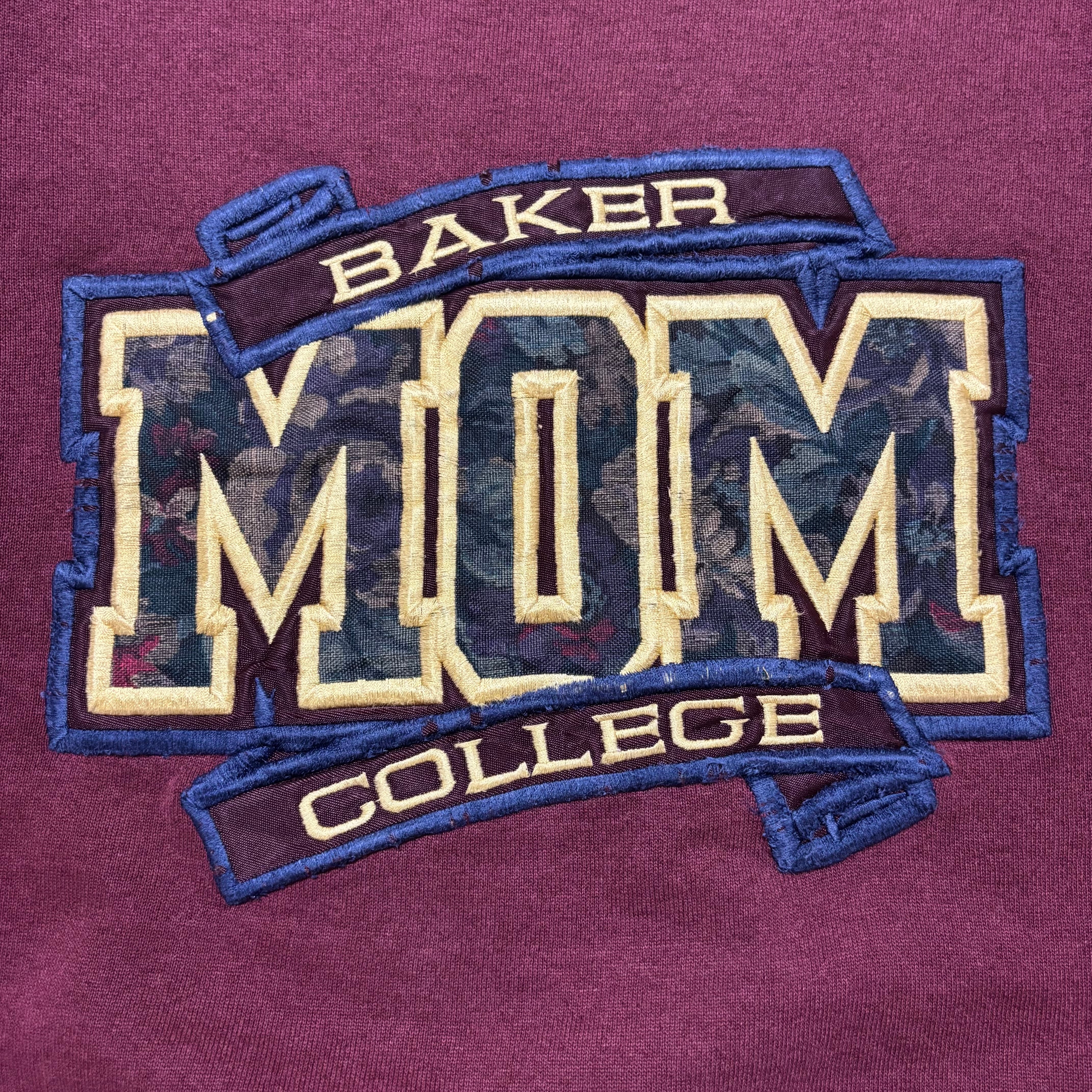 フロントに「BAKER COLLEGE MOM」のビッグロゴが立体刺繍+花柄生地でデザインされた存在感のある一枚。