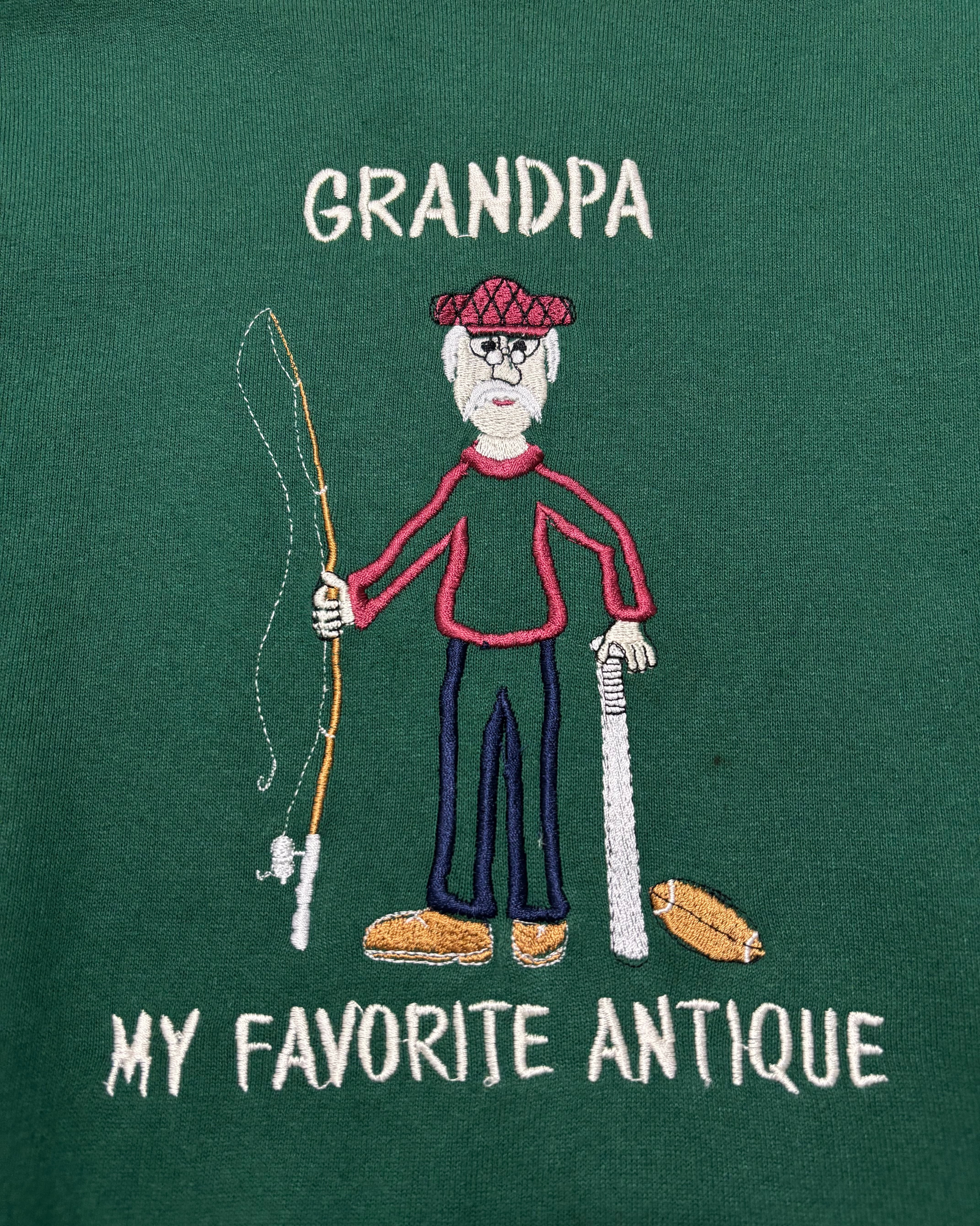 フロントに「GRANDPA」「MY FAVORITE ANTIQUE」と釣り竿を持つおじいちゃんの刺繍入り。