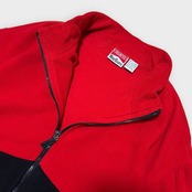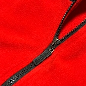 レッド×ブラックの大胆な切替デザインで、企業ロゴ系・90sライクな雰囲気が強い一着です。