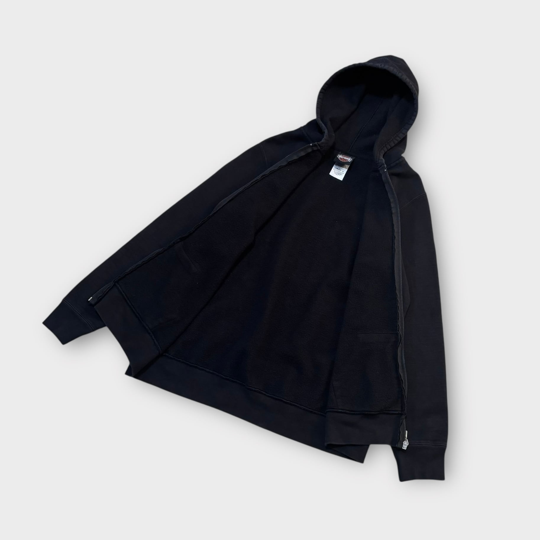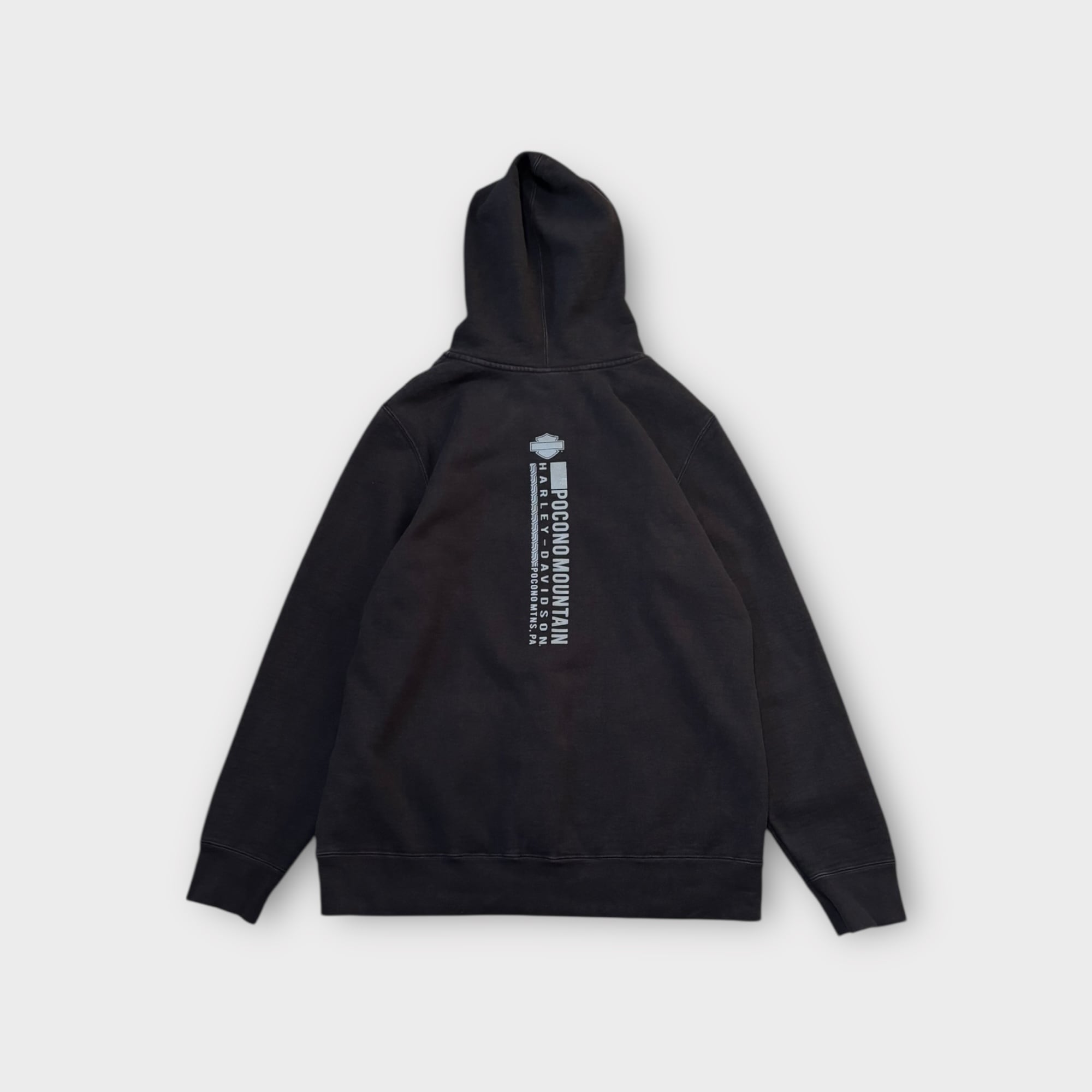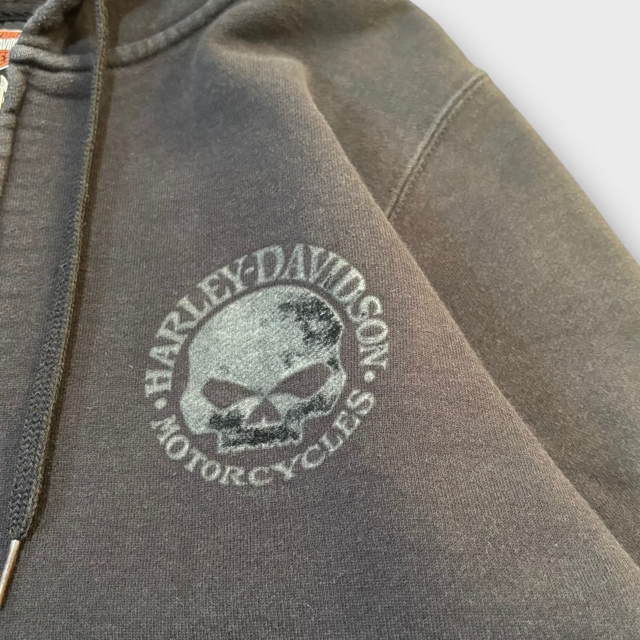 フロントはスカルロゴのワンポイント、バックには縦配置のロゴプリントが入る存在感のある一着。