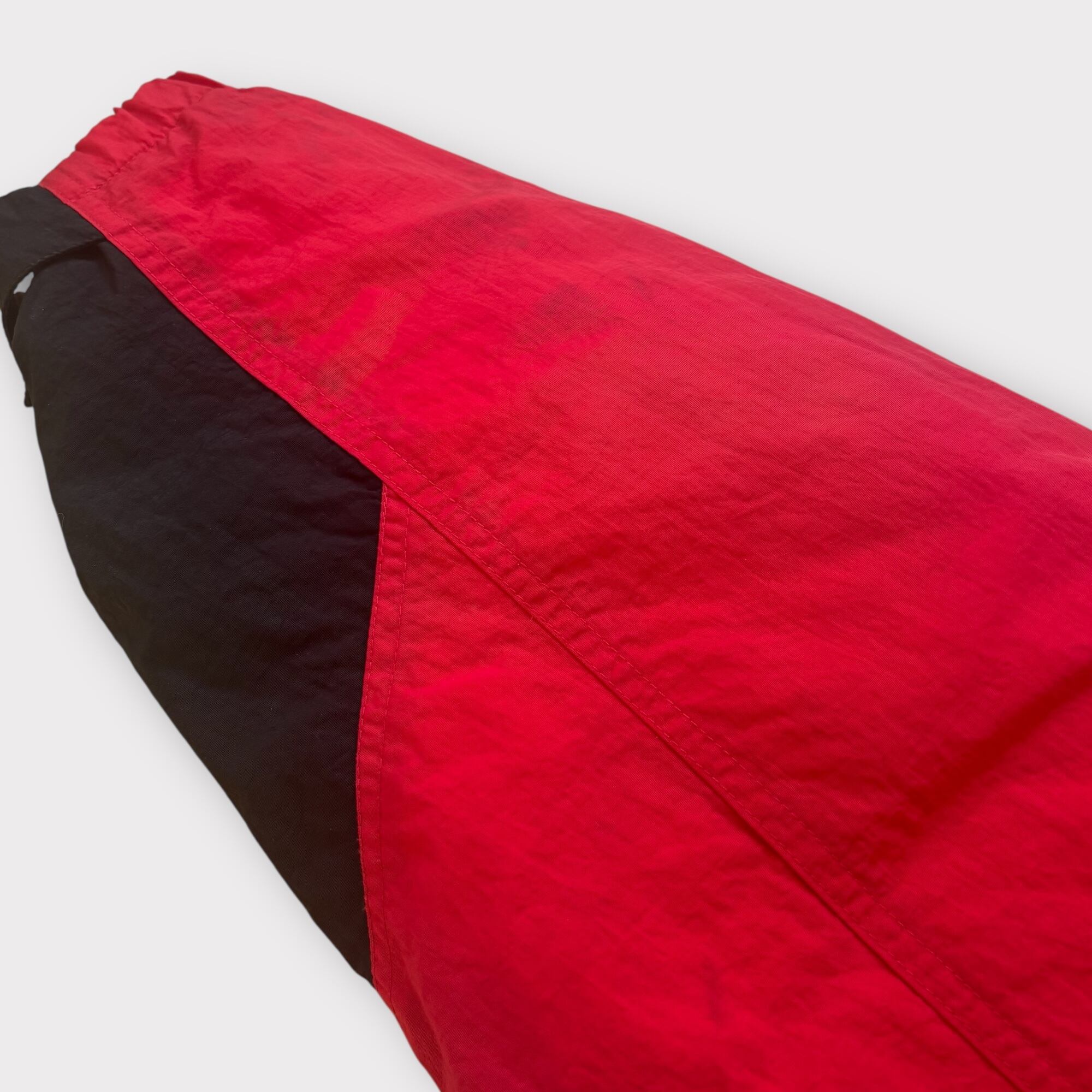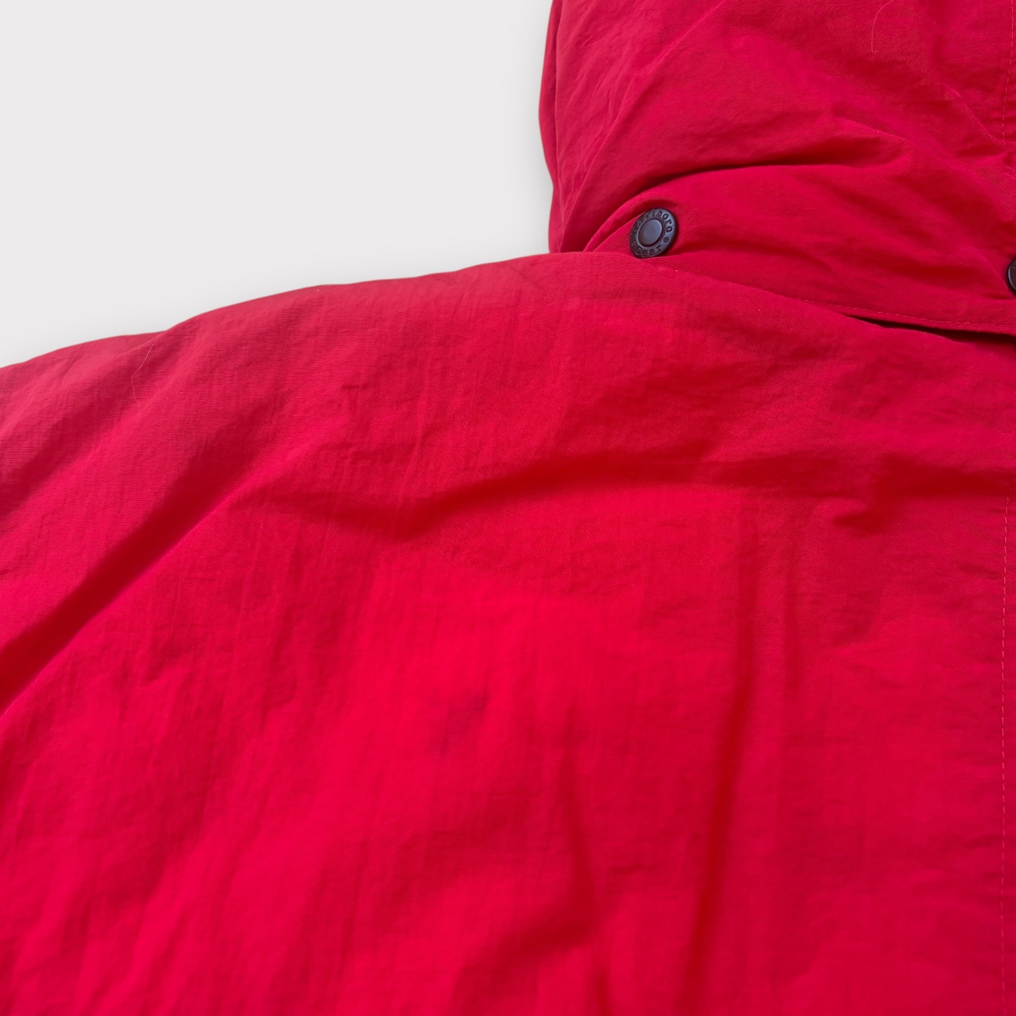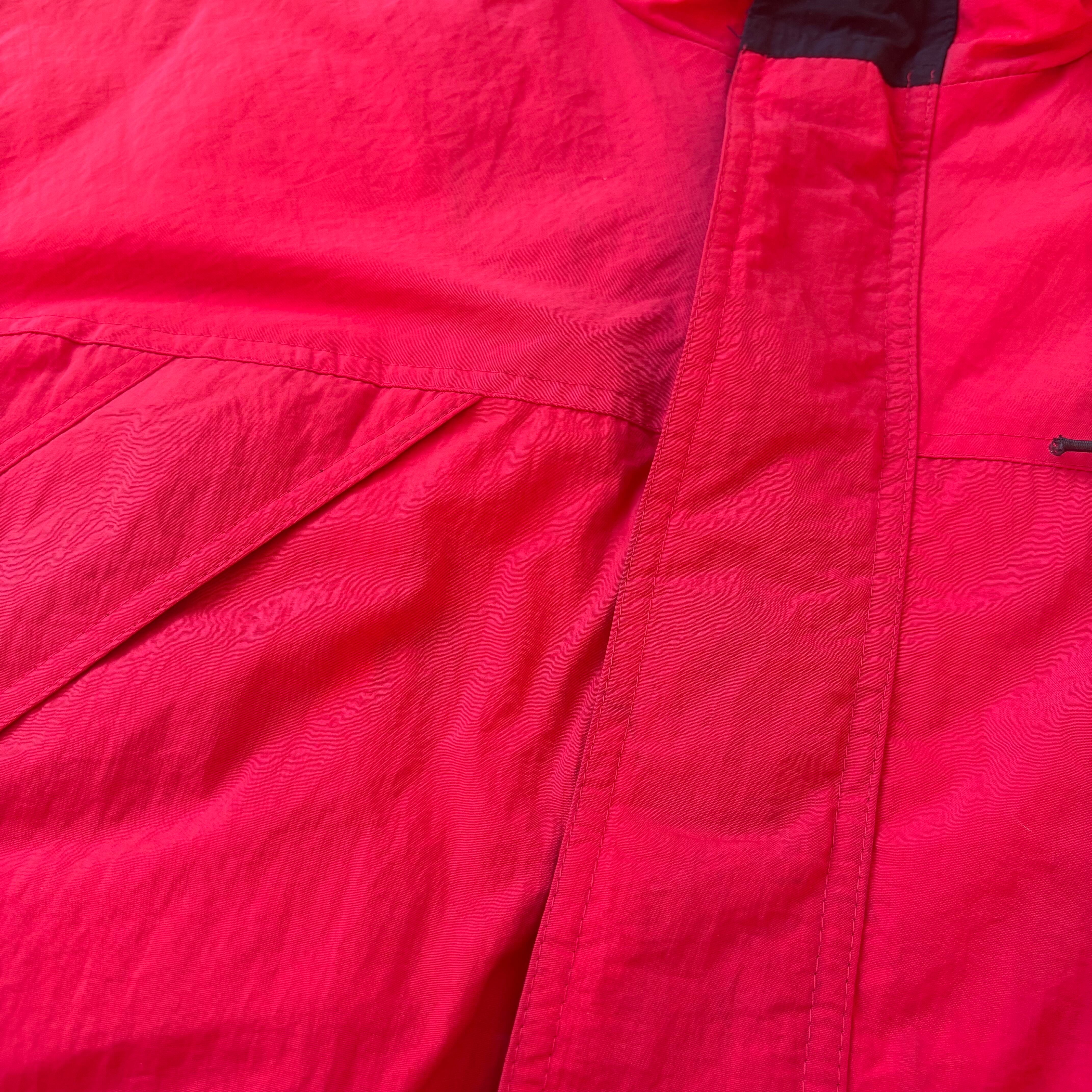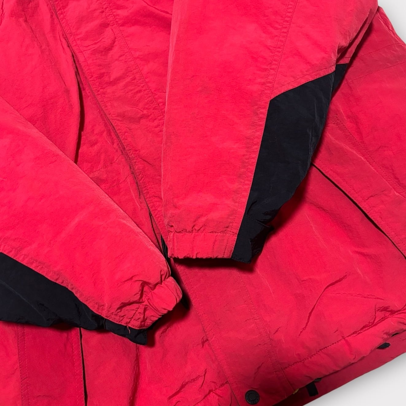 鮮やかなレッドボディに胸元のロゴワッペンが映える一着。