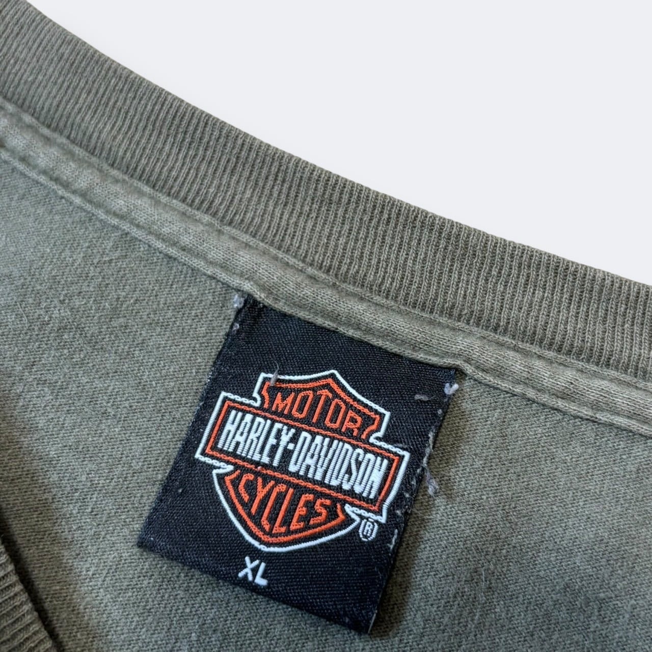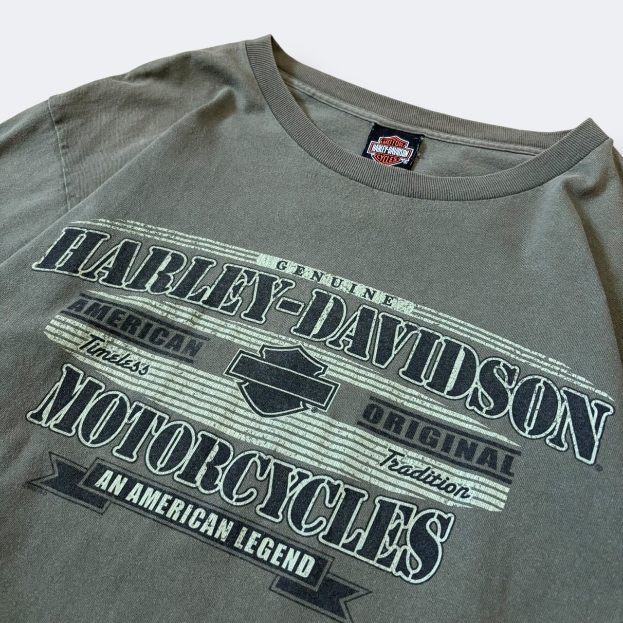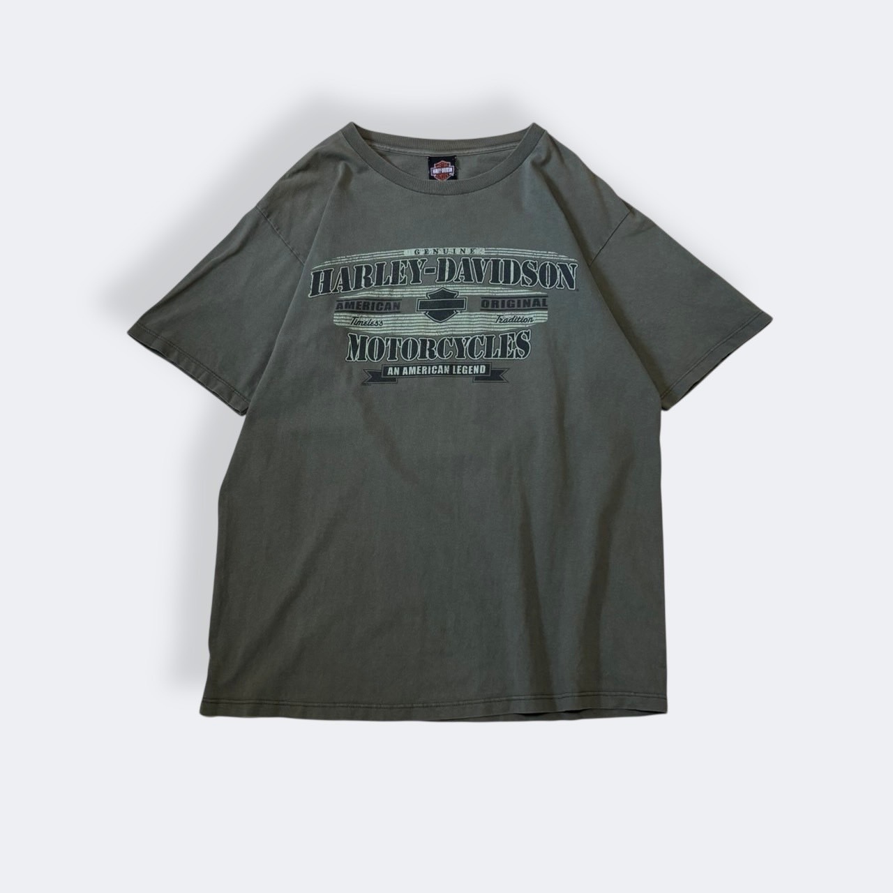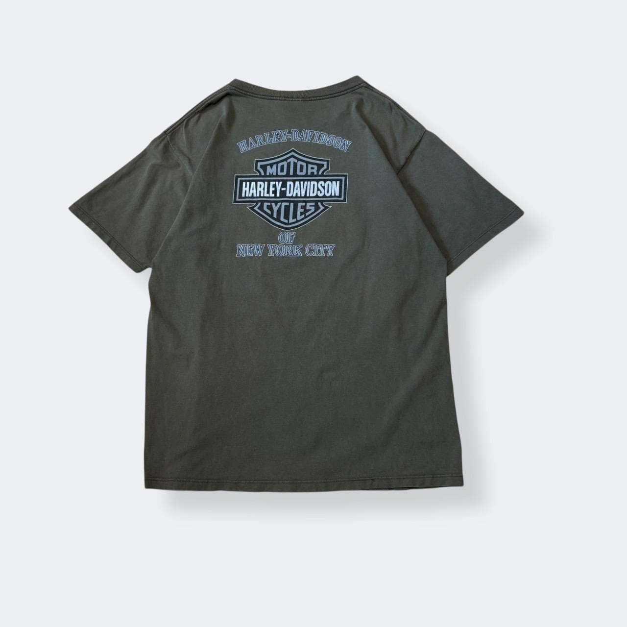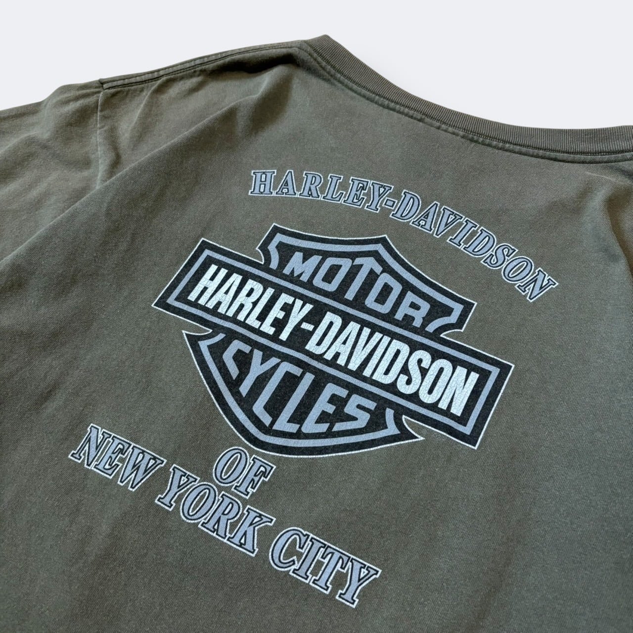 落ち着いたカーキカラーのボディに、フロントは「HARLEY-DAVIDSON MOTORCYCLES」の大きなロゴプリント、バックにはニューヨークのディーラープリントが入った両面デザイン。