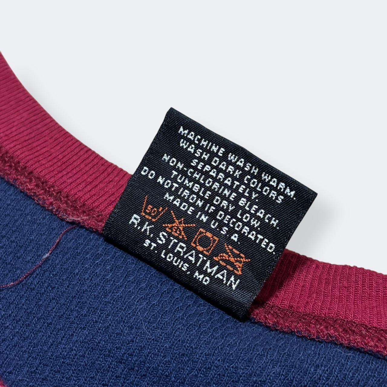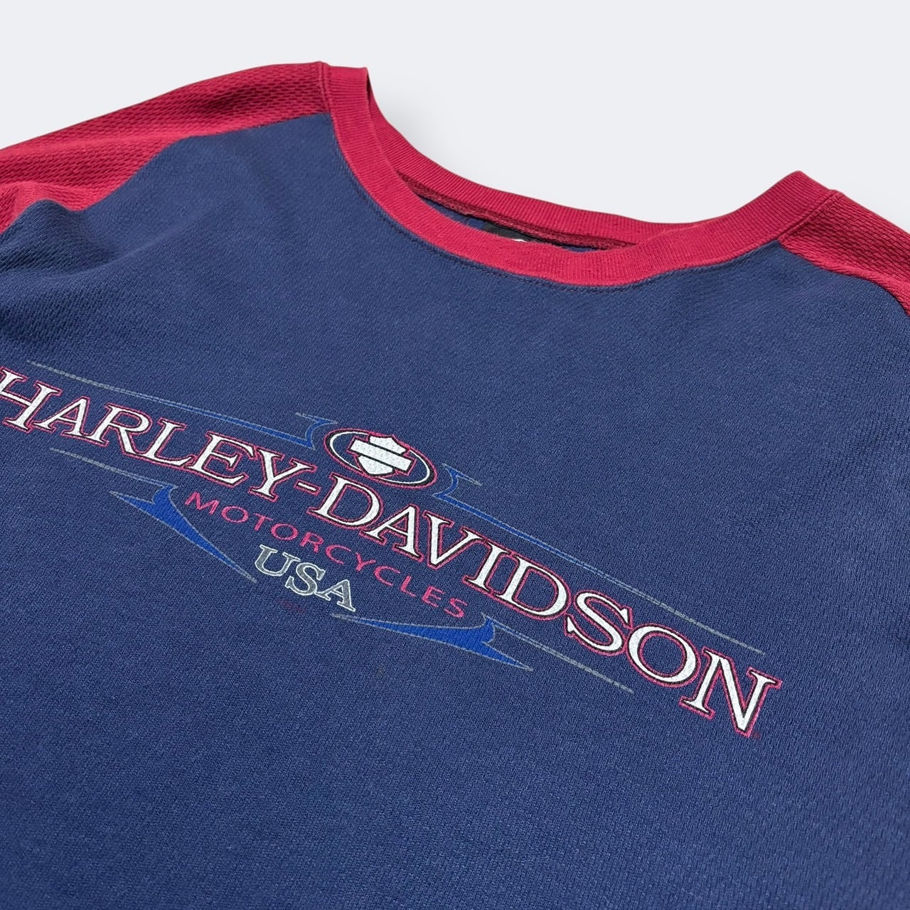 ネイビーボディにレッドスリーブの切り替えデザインで、フロントには「HARLEY-DAVIDSON MOTORCYCLES USA」プリント。