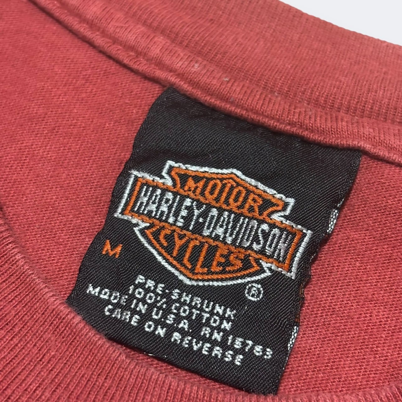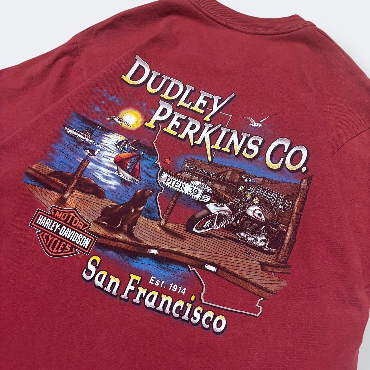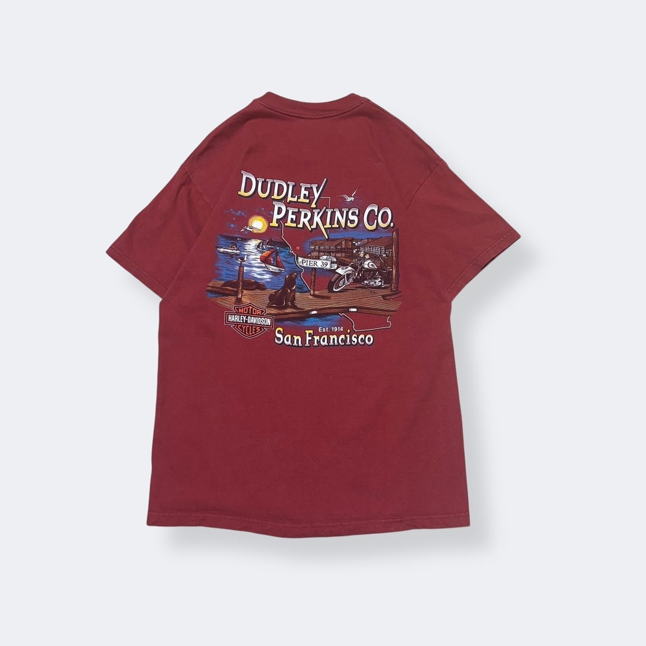 フロントにはHarley-Davidsonロゴプリント、バックにはサンフランシスコの老舗ディーラー「DUDLEY PERKINS CO.」のグラフィックが入る両面プリントデザイン。