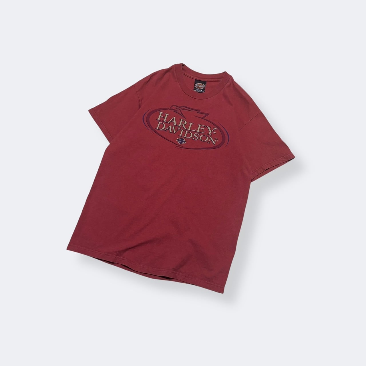港の風景やバイクが描かれた存在感のあるバックプリントで、ハーレーTらしい雰囲気。