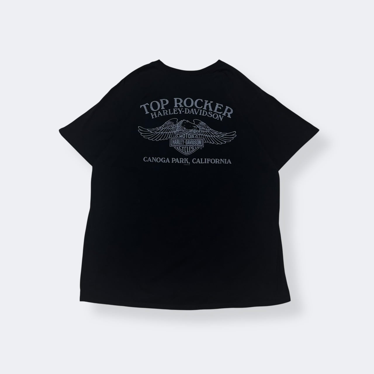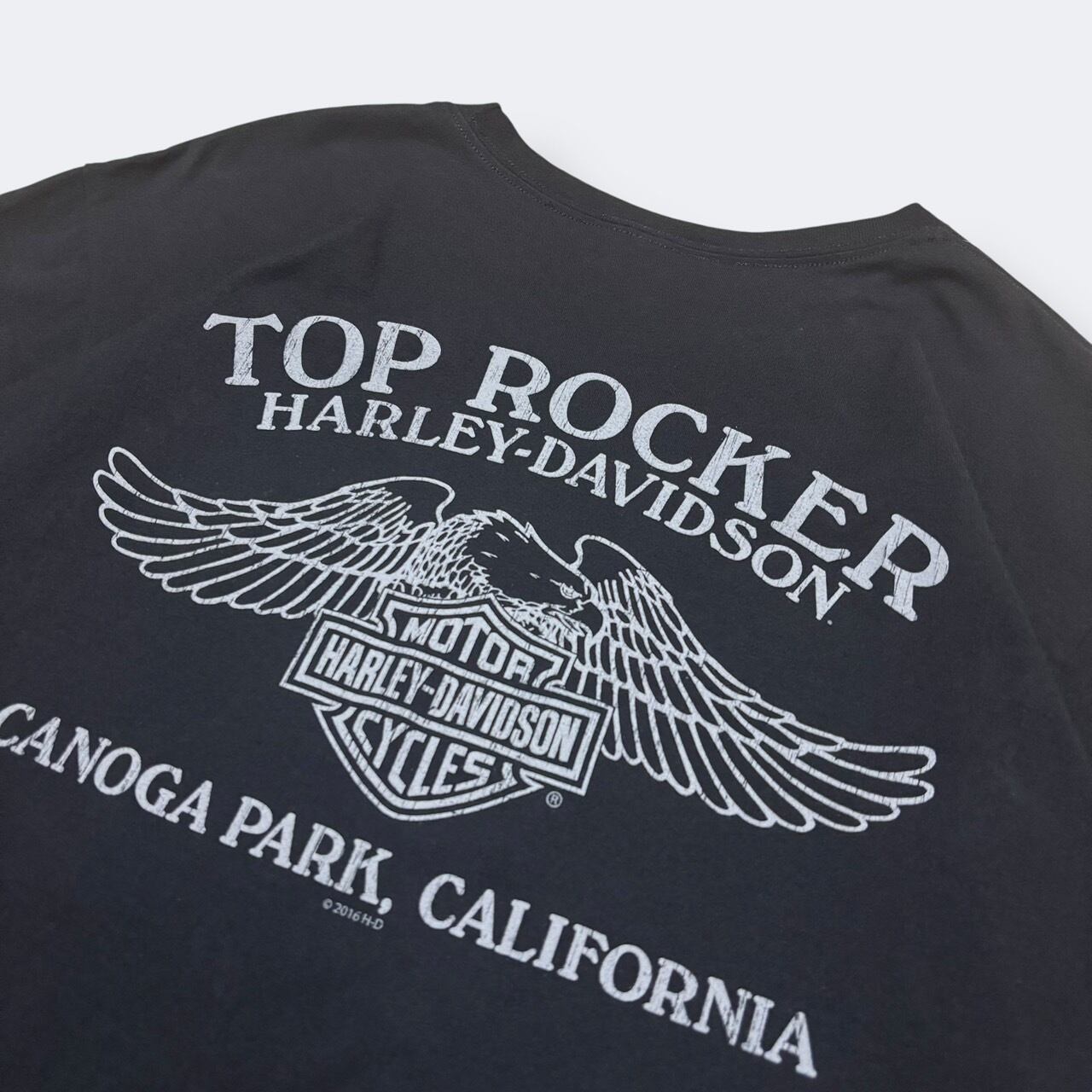 フロントにはHarley-Davidsonロゴプリント、バックにはカリフォルニアのディーラー「TOP ROCKER Harley-Davidson」のグラフィックが入る両面プリントデザイン。